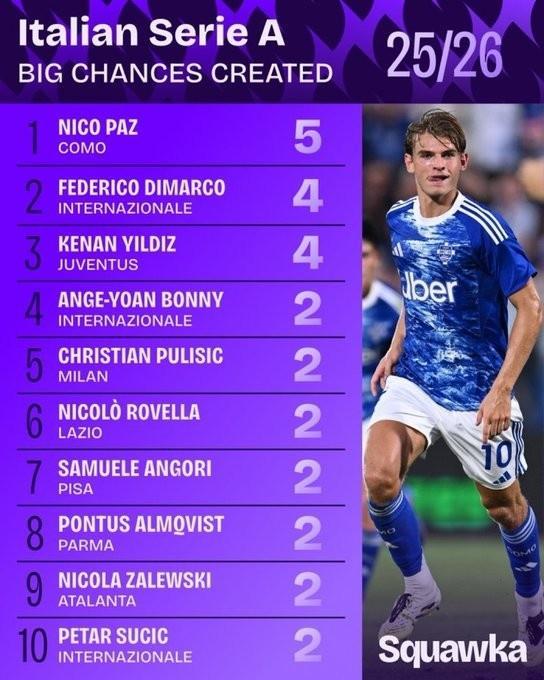9月26日讯 知名足球数据网站Squawka统计了2025/26赛季意甲联赛截至目前的球员创造重大机会榜。