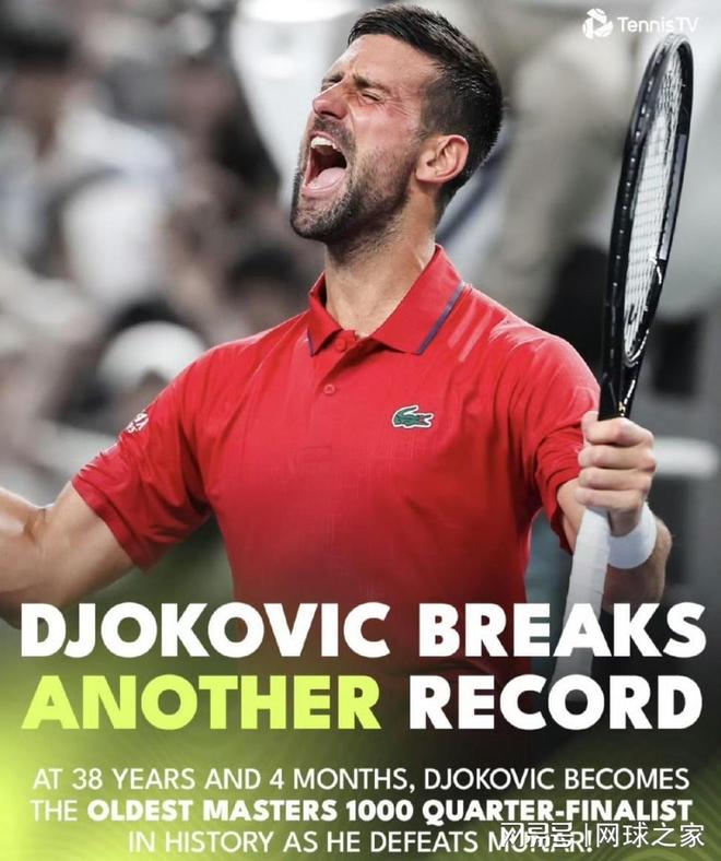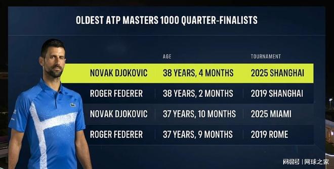 此外,这场被球迷和网友称为惨胜的对决,也让德约以38岁133天的年龄,成为了在大师赛闯入八强最年长的球员,一举超过了瑞士天王费德勒。费德勒此前保持这项纪录的年龄是38岁60天,现在被德约将之作古了。