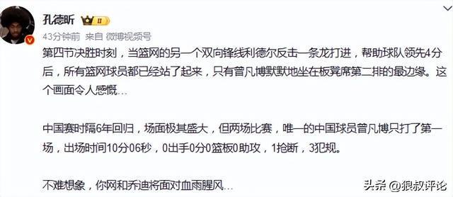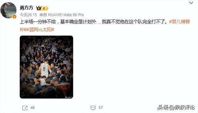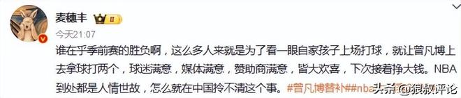 媒体人三土带刺发文表示:对于NBA中国赛来说,未必有那么多人想来看曾凡博,但一定有为他而来的,特别是一些首钢的球迷!无论如何,第二场不让上有些说不过去。这一次的NBA之旅,可以说,基本上结束了,如果有不错的机会,依旧支持他在外面历练。