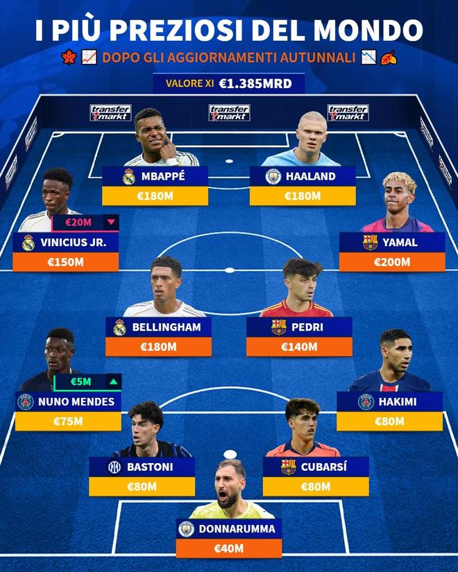 在完成最新一次身价更新后,德国转会市场网站列出了世界足坛最贵阵容,皇马、巴萨各3人,曼城、巴黎各2人,国米1人。