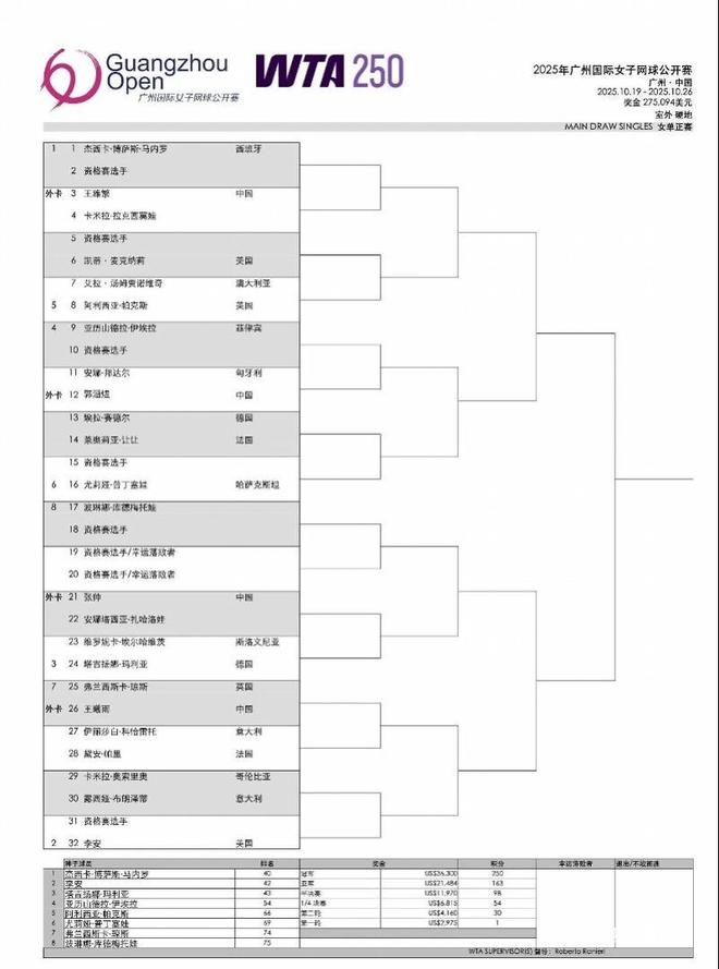 张帅领衔四金花出战!2025年广网单打签表出炉