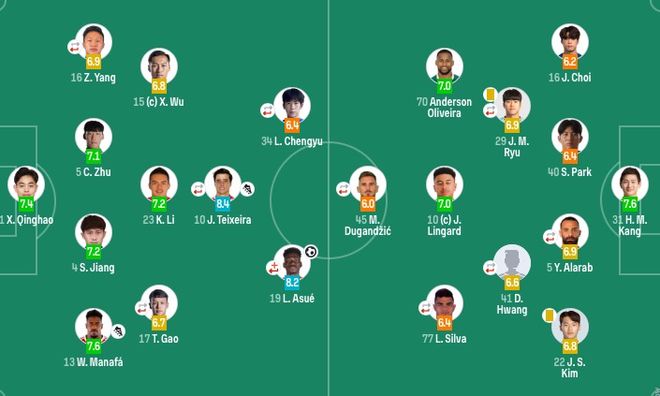 上海申花首发(4-2-3-1)门将:1-薛庆浩后卫:13-马纳法(F)、4-蒋圣龙、5-朱辰杰、16-杨泽翔(66'27-陈晋一(F))后腰:23-李可、15-吴曦前卫:17-高天意(66'7-徐皓阳)、10-特谢拉(F)(92'43-杨皓宇)、34-刘诚宇(46'9-安德烈-路易斯(F))前锋:19-阿苏埃(F)(69'11-绍洛-米内罗(F))替补未出场:30-鲍亚雄、2-王世龙、3-金顺凯、32-艾迪、6-阿马杜(F)、33-汪海健、45-韩嘉文首尔队首发(4-3-3)门将:31-姜贤茂后卫:40-朴声勋、5-亚赞·阿拉伯(F)(46'20-李韩道)、22-金珍洙、16-崔俊中场:10-杰西·林加德(F)、41-黄度允(87'7-郑承原)、29-柳在文(59'8-李胜模)前锋:70-安德森·奥利维拉(F)(46'27-文宣民)、77-卢卡斯·席尔瓦(F)、45-马尔科·杜甘季奇(F)(75'11-千成薰)替补未出场:21-崔喆元、、9-曹永旭、18-郑泰旭、33-裴炫瑞、36-金志源、63-朴秀日、88-朴张韩杰主裁:阿卜杜拉-贾迈利(科威特) VAR:阿卜杜拉-阿拉伯(科威特)