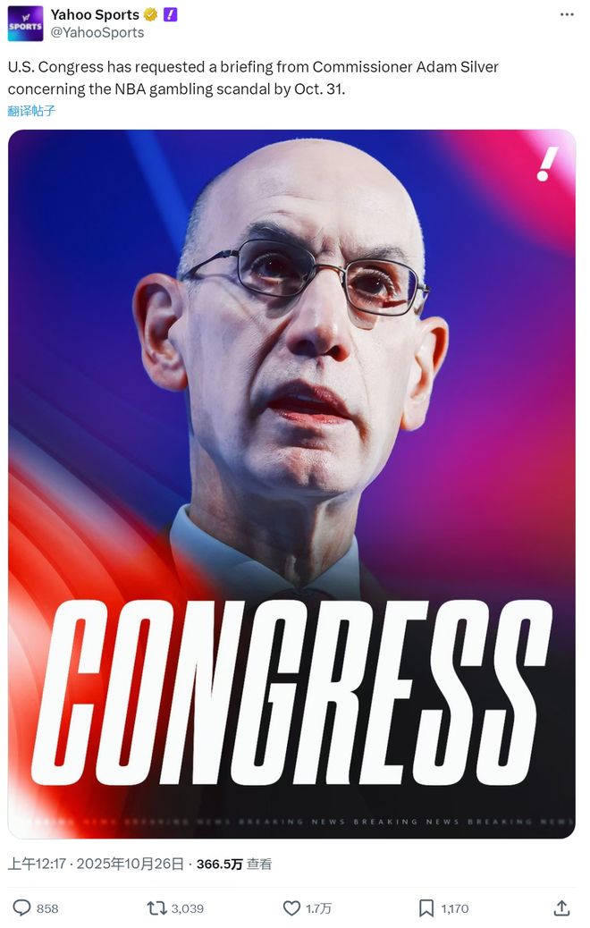 NBA 的赌球丑闻已从联盟内部风波,升级为惊动美国国会的重大事件!据雅虎体育报道,众议院能源与商业委员会正式介入调查,给 NBA 总裁亚当 - 萧华下了最后通牒:必须在 10 月 31 日前就系列赌博丑闻作出详细汇报。面对国会的追问,萧华回应 “深感震惊和不安”,承诺联盟全力配合调查,可这看似强硬的表态,却难掩联盟在赌球监管上的失职 —— 短短一年半时间,NBA 已出现 30 起赌博相关指控,是 2024 年前总案例数的 6 倍,而罗齐尔、比卢普斯、达蒙 - 琼斯的被捕,只是这场风暴的冰山一角。