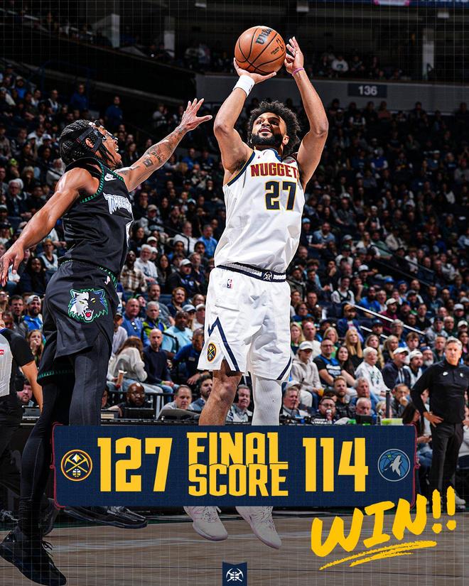 NBA常规赛继续进行,掘金奔赴客场与森林狼展开对决。安东尼爱德华兹与克拉克伤停,背靠背作战的明尼苏达面临着严峻的体能考验。丹佛在上赛季的西部半决赛抢七不敌森林狼,掘金渴望在此役完成复仇。丹佛的首发五虎依然是约基奇、穆雷、戈登、布劳恩与卡梅隆约翰逊。迪文琴佐、康利、麦克丹尼尔斯携手兰德尔、戈贝尔出任森林狼首发。约基奇与兰德尔、戈贝尔、里德3大内线的较量,是此役的最大看点。约基奇25+19+10创NBA历史第2神迹,掘金力擒森林狼!穆雷43+6+单节23分暴走!全场比赛回顾首节开打,丹佛更快进入了状态,在约基奇、穆雷的带领之下,掘金实现了内外开火,并一度取得了12分的领先优势。麦克丹尼尔斯携手兰德尔率队追分,分差逐渐被蚕食。两队在场上开始对轰,首节打完,掘金以34比30领先。穆雷持球进攻