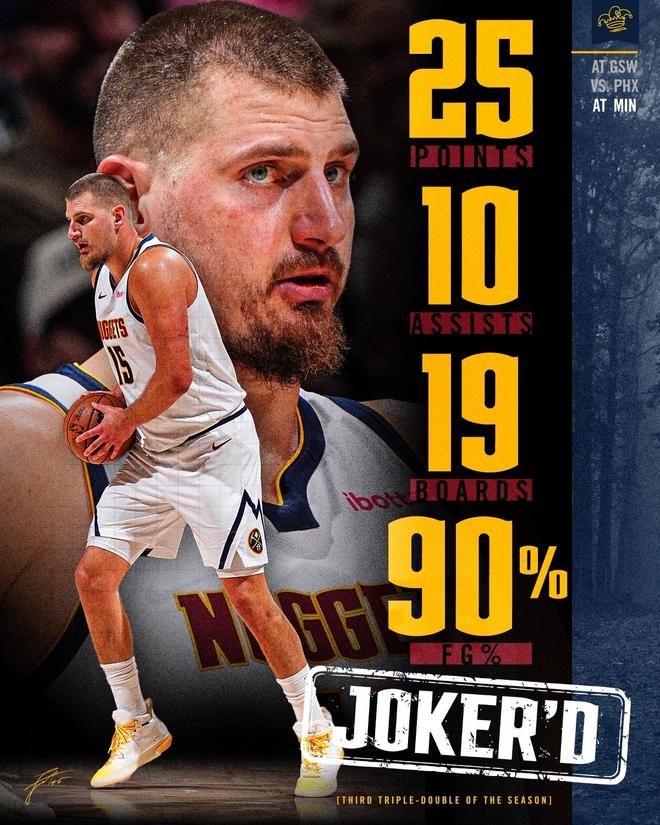 掘金力擒森林狼掘金队,小哈达威11中7,三分球6中4高效的砍下了20分1板3助,第3节砍下15分成为取胜功勋。沃特森12分2板1助2帽、戈登10中3仅仅得到9分3板3助、布劳恩7分3板2助2断、卡梅隆约翰逊5分2板2助,因伤退场。瓦兰丘纳斯4分4板、布鲁斯布朗4中1得到了2分5板。约基奇25+19+10创NBA历史第2神迹掘金队超级巨星尼古拉约基奇,在该场比赛迎来暴走。约基奇在36分钟的上场时间里,10中9,罚球7中7,狂轰25分19篮板10助攻2抢断1盖帽的大号三双数据,正负值+17高居全场第三。约基奇在进攻端予取予求,他仅仅投丢1球,有着90%的极高命中率。并且,约基奇在此役没有远投出手。在禁区肆虐的约基奇,展现了顶级的内线进攻技术。戈贝尔防守约基奇