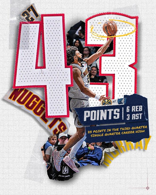 穆雷在第3节进入了得分模式,他单节12投7中,三分球5投3中,罚球4投全中,以58%的命中率轰下了23分。依靠着穆雷在第3节的暴走,掘金单节以45比29碾压对手,这也是丹佛最终取胜的关键。并且,单节23分还创下了穆雷单节得分新高。穆雷43分6板+单节23分暴走