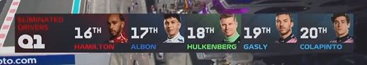 第五至第十名分别是:勒克莱尔、阿隆索、博托莱托、奥康、哈贾尔和角田。汉密尔顿在Q1被淘汰,连续三站比赛无缘Q2。