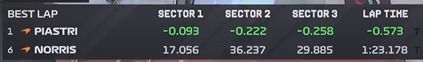 对比两辆麦克拉伦,仅从Q1的第二个飞行圈来看,皮亚斯特里在三个计时段的表现上都优于队友诺里斯不少。