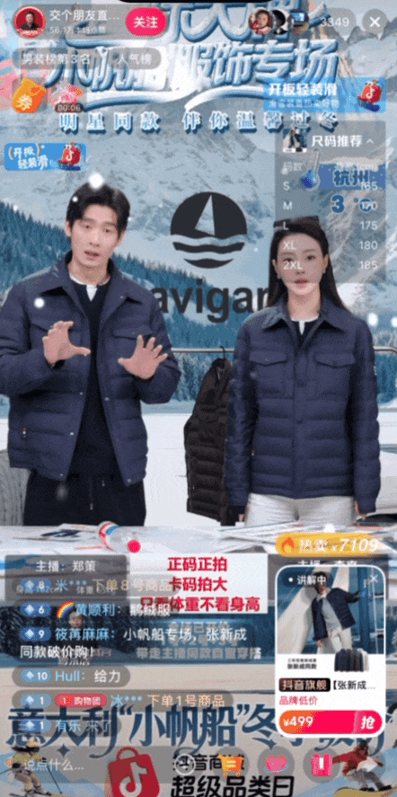 庞大的流量迅速转化为市场动能,直接促进了相关品类销量显著攀升,“轻装滑”趋势带动羽绒、滑雪等类目支付金额同比增长54%。东方甄选、与辉同行、交个朋友等头部直播间纷纷开设趋势种草专场;骆驼、雪中飞等品牌直播间内,相关商品交易额表现亮眼,印证了“轻装滑”背后可观的市场潜力。