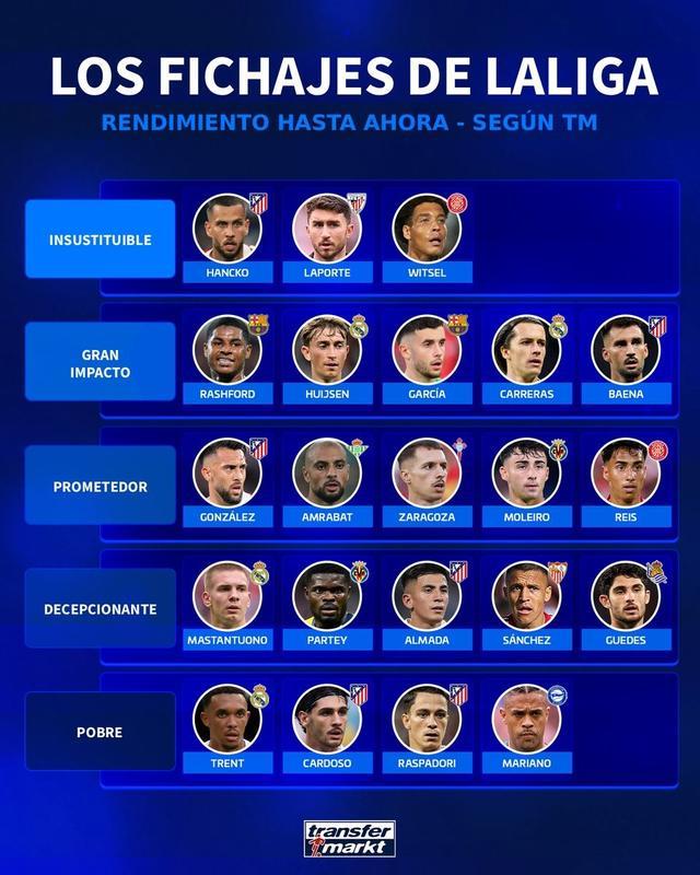 北京时间12月24日,德转对西甲今夏的几笔重要转会进行了评级,其中汉茨科、拉波尔特以及维特塞尔被评为无可替代,拉什福德、赫伊森等人被评为顶级,马斯坦托诺被评为令人失望,而亚历山大-阿诺德则被评为表现令人失望。
