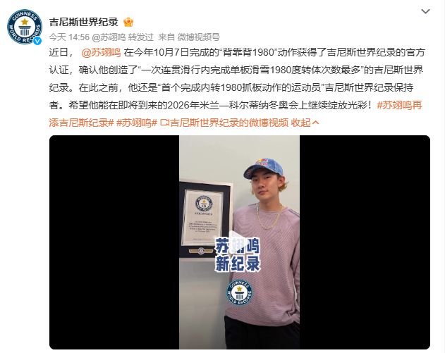 12月25日,吉尼斯世界纪录官方账号发布消息,正式认证了中国单板滑雪运动员苏翊鸣在今年10月7日完成的“背靠背1980”动作,确认他创造了“一次连贯滑行内完成单板滑雪1980度转体次数最多”的吉尼斯世界纪录。