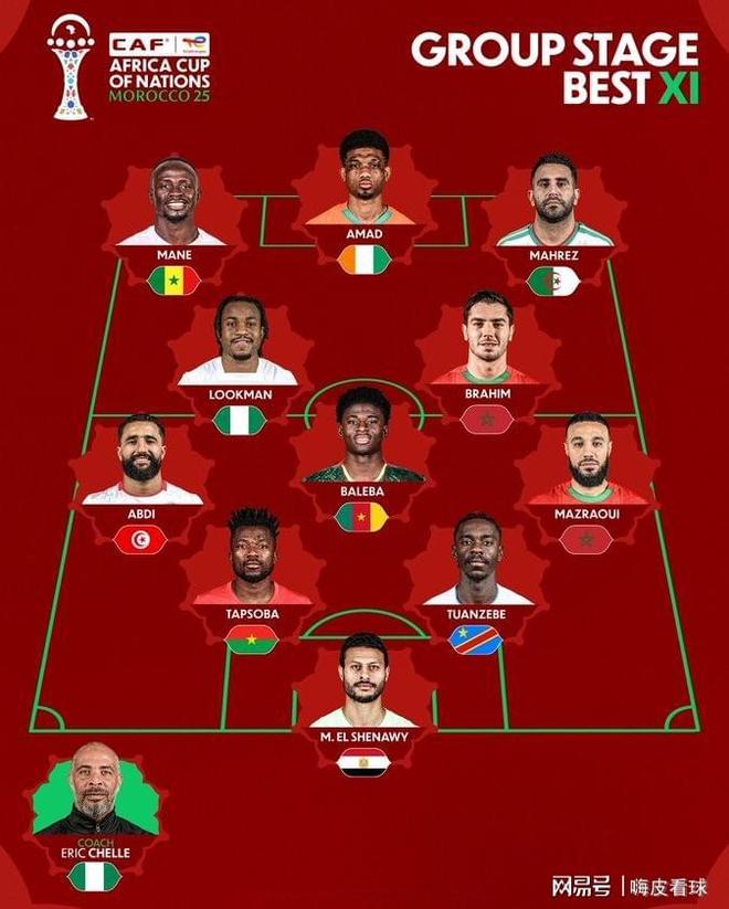 非洲杯官方公布,小组赛最佳11人出炉,门将是埃及的希纳维,后卫包括马兹拉维、图安泽贝、塔普索巴和阿卜迪,中场包括巴莱巴、卢克曼和迪亚斯,前锋包括马内、迪亚洛和马赫雷斯,主教练则是来自尼日利亚的谢勒。